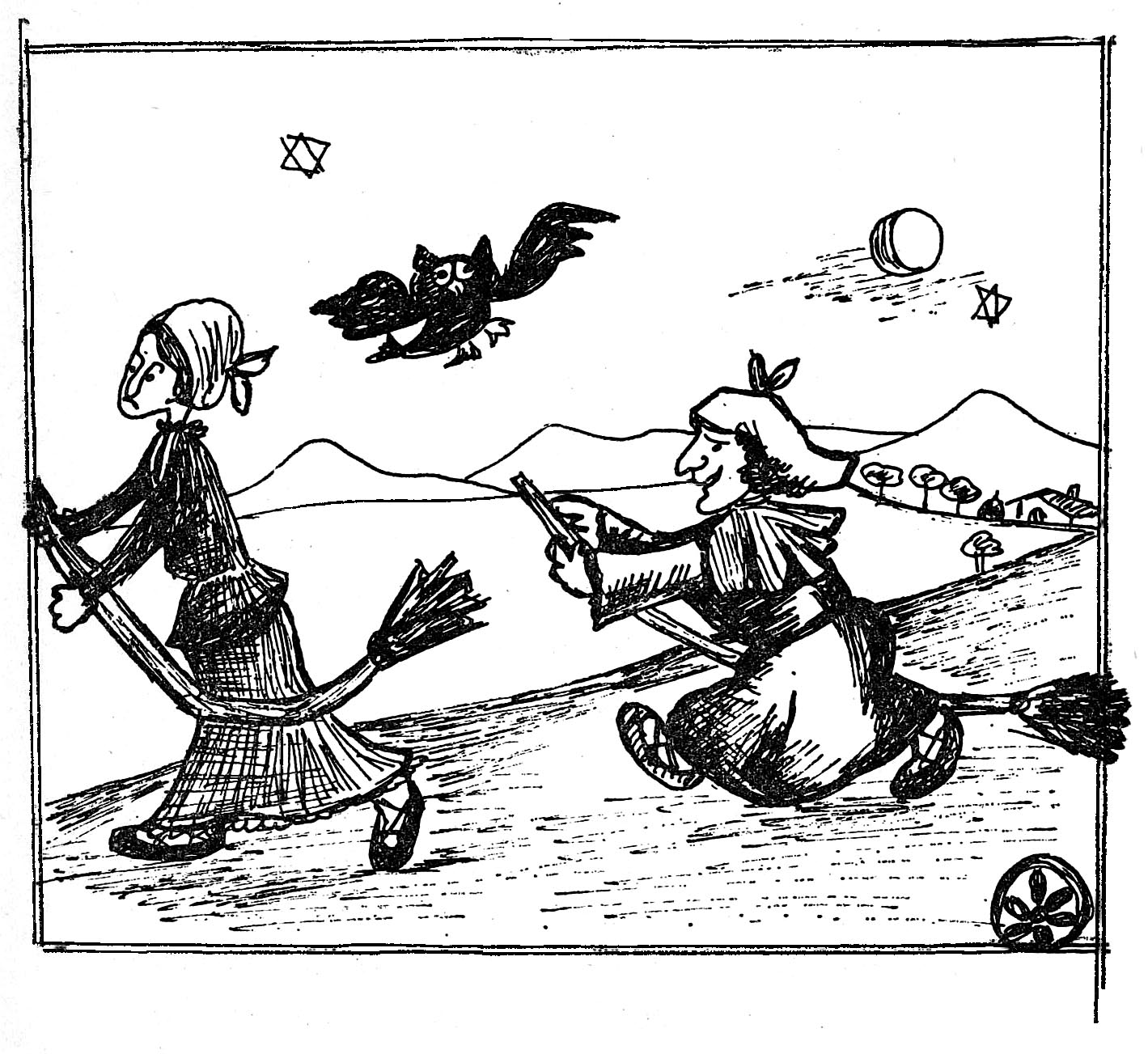 (Ager-lekua ia ilunpean dago. Laster agertuko diren bi sorgin ikusteko hainbat argi dago, doidoian. Ertz batetik, burua beldurrez atereaz, sorgin bat agertzen da. Lodikotea bera, sugur eta masaila gorriz; nylonezko erratz edo eskoba bat darama. Zalantza handiz irtetzen da, bazter guztietara begiratuz.)